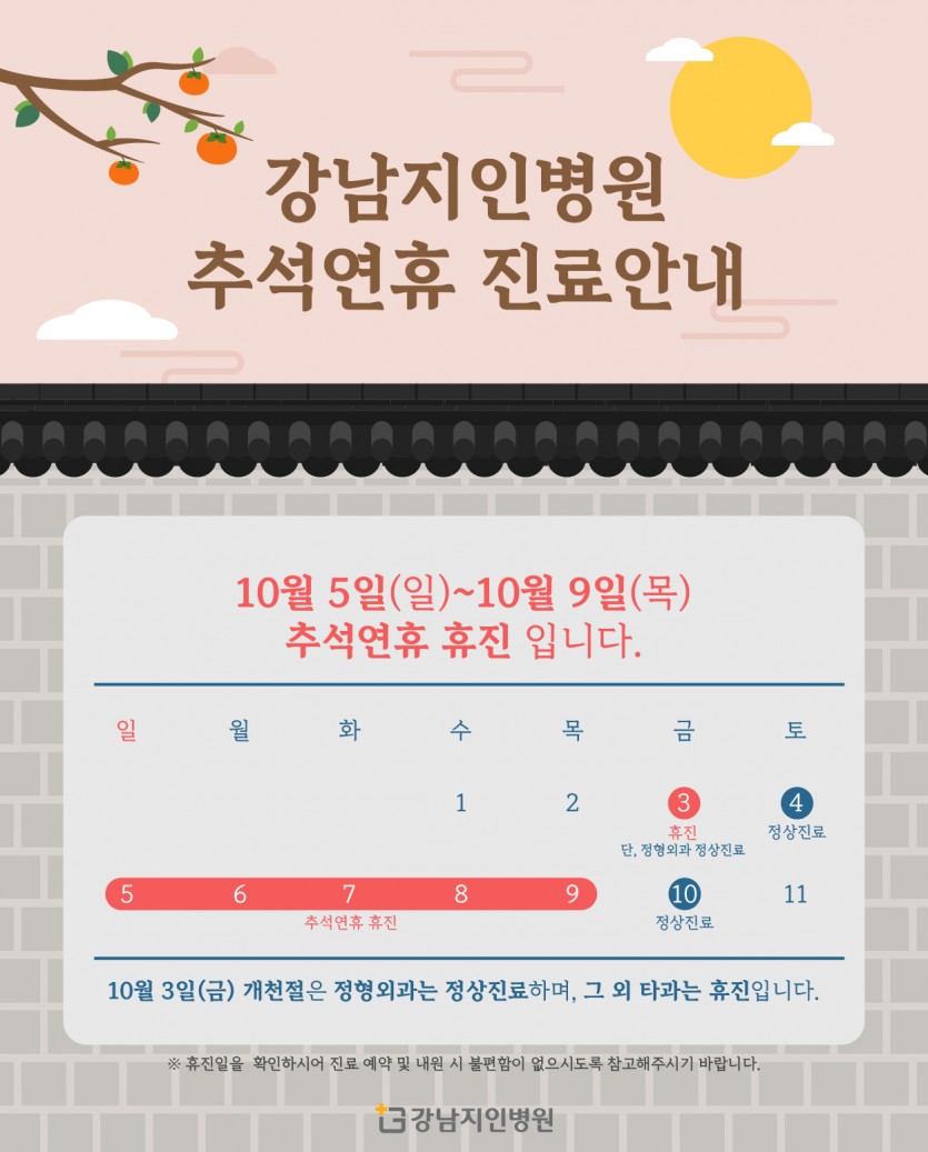 10월 3일 개천절 : 정형외과(정상진료) / 내과 외과 가정의학과 검진(휴진)